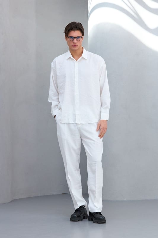 Beyazın en saf hali, modal kumaşın akışkan dokusuyla birleşti. Üzerine geçtiğin an fark edilen, ama bağırmadan dikkat çeken bir stil.