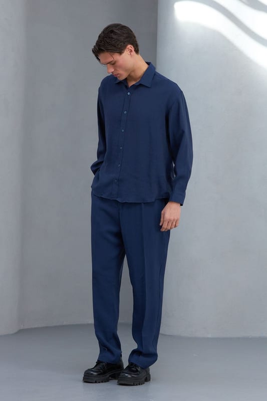 Zamansız şıklığın en net hali. Lacivert tonun asaleti, modal kumaşın yumuşak ve akıcı dokusuyla birleşerek hem konforlu hem güçlü bir stil sunar.