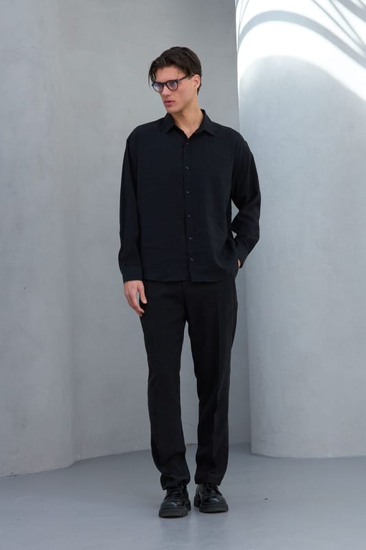 Siyahın en güçlü hali, modal kumaşın akıcı yapısıyla birleşti. Üzerine geçtiği anda kendini belli eden, sade ama etkisi yüksek bir parça.